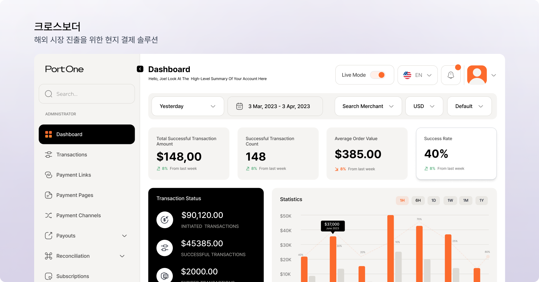 실결제를 위한 PG사 계약. 포트원 콘솔에서 신청 가능.